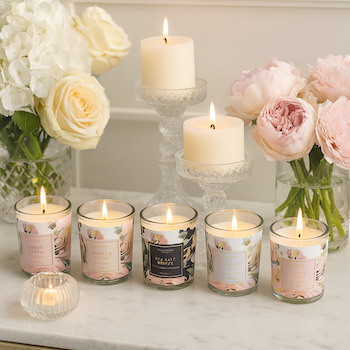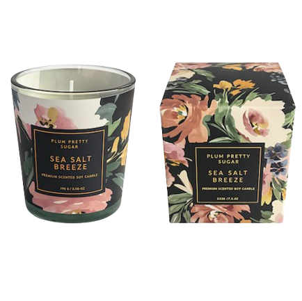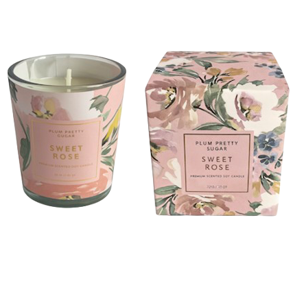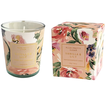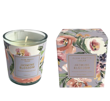 Vela perfumada en frasco de vidrio con estampa floral y caja haciendo juego